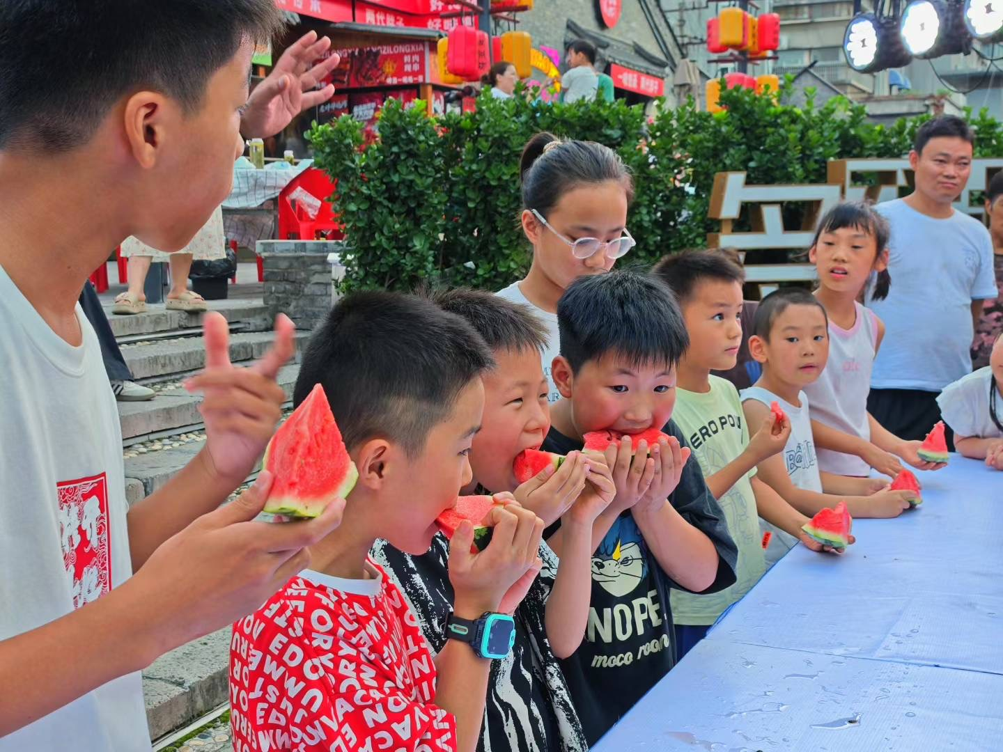 西瓜大赛,,,,甜蜜比拼,,,,共享清凉。。。。。夏日炎炎,,,,少不了西瓜的陪同,,,,庐州坊盛邀游客加入吃西瓜大赛,,,,速率与技巧并重,,,,为各人释下学习与事情压力,,,,开心竞赛。。。。。与此同时,,,,还设置了喝啤酒、剥龙虾、猜歌名等种种互动游戏,,,,让夏夜娱乐气氛满满。。。。。